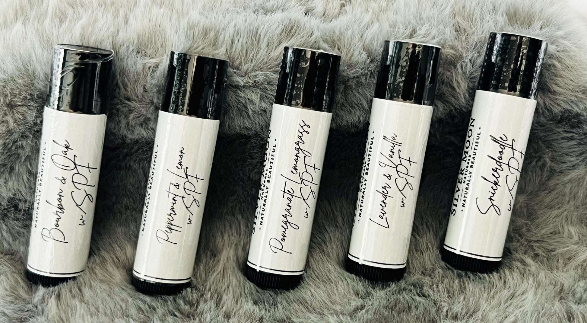 Comes in Plumping Peppermint and Lemon, Sexy Cinnamon and Clove, Luscious Lavender and Vanilla, and Puckering Pomegranate and Lemongrass. All with natural zinc oxide to prevent lips from getting burnt.